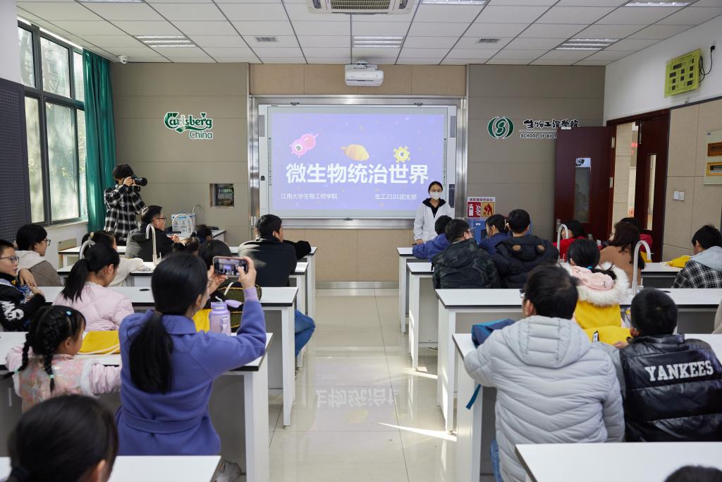 活动伊始,“荣毅仁特称团支部”生工2101班陶孟瑞、余思婷两位同学分别以“微生物统治世界”和“走近科学的色彩”为主题开讲科普小课堂。他们以大家身边常见的小事为切入点,如:为什么雨后会闻到泥土的香气?这种香气是如何产生的?他们还结合社会热点、影视作品,以通俗、生动有趣的语言向小朋友们介绍了生活中有哪些常见的微生物,它们对于人类的发展又有着怎样的作用等知识。小朋友们在课堂上认真听讲并积极回答问题,发散自己的思维,现场气氛非常活跃。