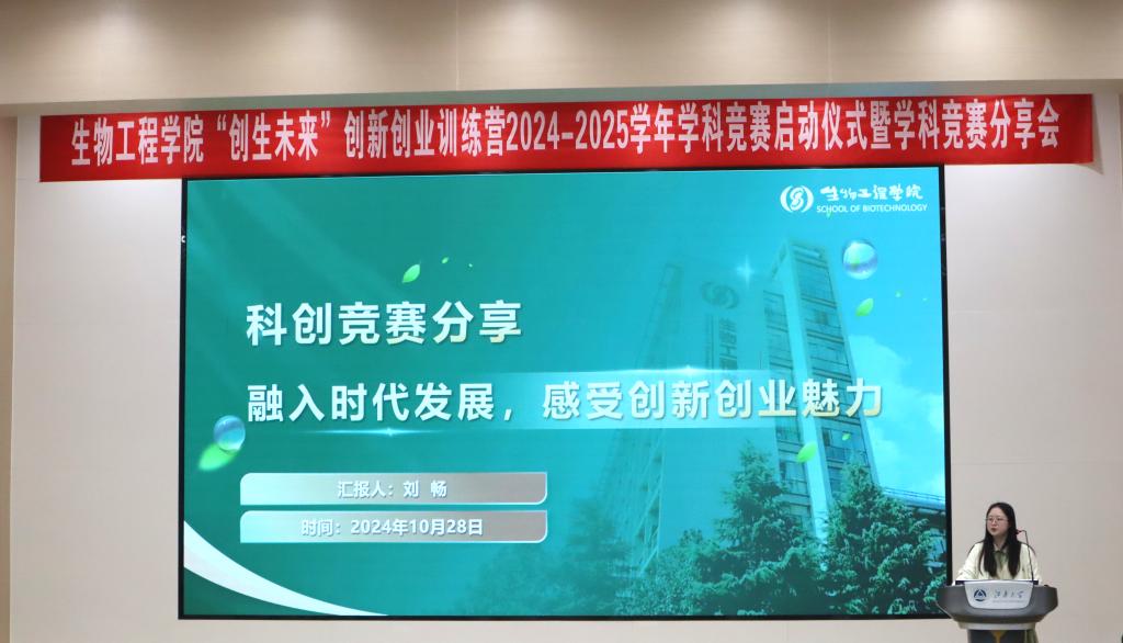 接着,全国生命科学竞赛、国家级大学生创新创业训练项目、中国国际大学生创新大赛以及挑战杯揭榜挂帅赛项目负责人分别作学科竞赛经验分享。作为第九届全国生命科学竞赛国赛二等奖获得者代表,陈萌轩从时间管理、实验技能、材料撰写、困难应对、心态调节等五方面详细分享了在参与生命科学竞赛过程中的感悟体会,为参与2025年第十届全国生命科学竞赛的学弟学妹们提供宝贵的实战经验。作为国家级大学生创新创业训练项目的团队代表,张耀增带来《基于乳酸菌开发的创新型健康饮品》项目报告分享,从项目背景、行业痛点、技术理念、技术难点、商业分析等角度全面展示国家级大创项目研究内容,为新一学年参与大创项目的学生提供创新性典范展示。作为第十八届“挑战杯”全国大学生课外学术科技作品竞赛“揭榜挂帅”专项赛特等奖获奖代表,赵东琳结合自身竞赛经历,从队伍创建、项目准备以及答辩展示等方面,为即将参与竞赛的同学们进行详细剖析,提供经验案例指导。作为2024年中国国际大学生创新大赛金奖获奖代表,常泽鹏进行项目展示《芯想食成—首创中国食品检测“活肠道”》,该项目将人体活性肠道组织以器官芯片形式与仿生反应器结合,为个性化营养方案制定、疾病预防与干预等提供更加精准的科学依据。此外,他还从挖掘竞赛创新点、理顺逻辑思路、分析实验数据等环节分享了备赛心得体会。
