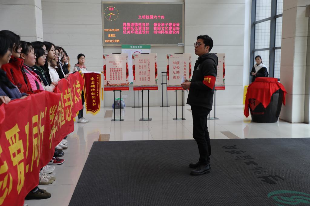 周云龙副书记首先做动员讲话,他从雷锋为人民服务的故事切入,结合祁发宝等卫国戍边英雄怀着“清澈的爱 只为中国”的信念,把青春、鲜血乃至生命留在喀喇昆仑高原,筑起巍峨界碑的感人事迹,引发同学们对雷锋精神的深入思考。他鼓励同学们,学习雷锋精神就是把“爱国”两个字放在心里,践行在平常、融入在日常、重点在经常。站在两个一百年的交汇点上,新时代青年要把全心全意为人民服务、投身社会主义现代化强国建设,切切实实地落在行动上。