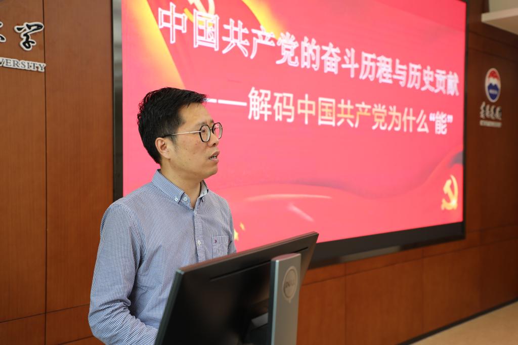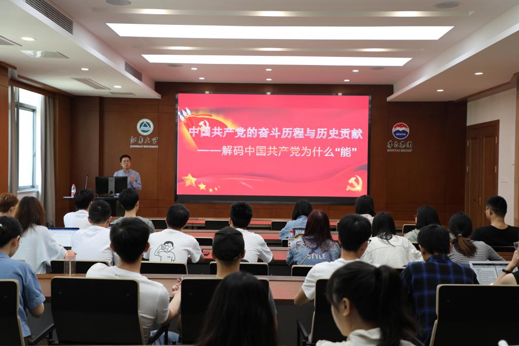 不忘来路,以史鉴今。5月21日,beat365中文官网党委副书记周云龙在茅台厅为酿造微生物与应用酶学研究室党支部党员讲授党史学习教育专题党课《中国共产党的奋斗历程与历史贡献——解码中国共产党为什么“能”》。