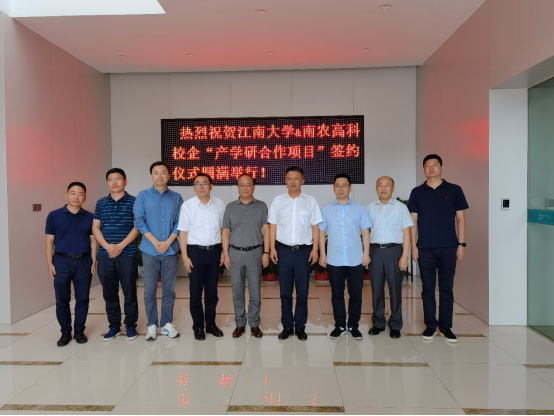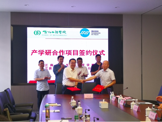10月10日,beat365中文官网党委书记王维、院长许正宏、药学院教授史劲松一行赴江苏南农高科技股份有限公司进行考察交流并开展产学研合作项目签约。南闸街道党工委书记李志浩、办事处主任费天雄及相关部门负责人,南农高科董事长周成、总经理韩耘及公司研发中心负责同志共同参加交流会。会议由南农高科副总经理周琳主持。
