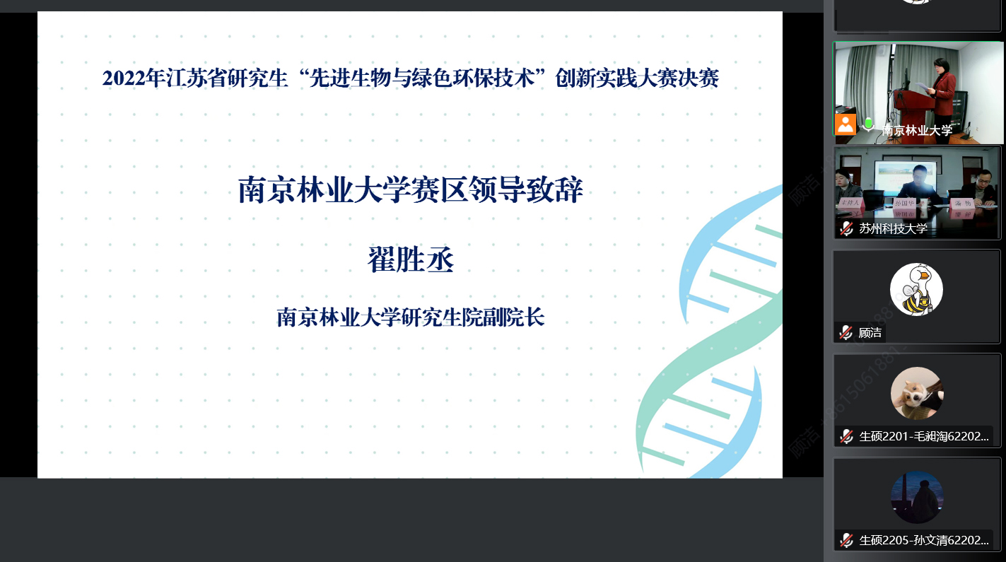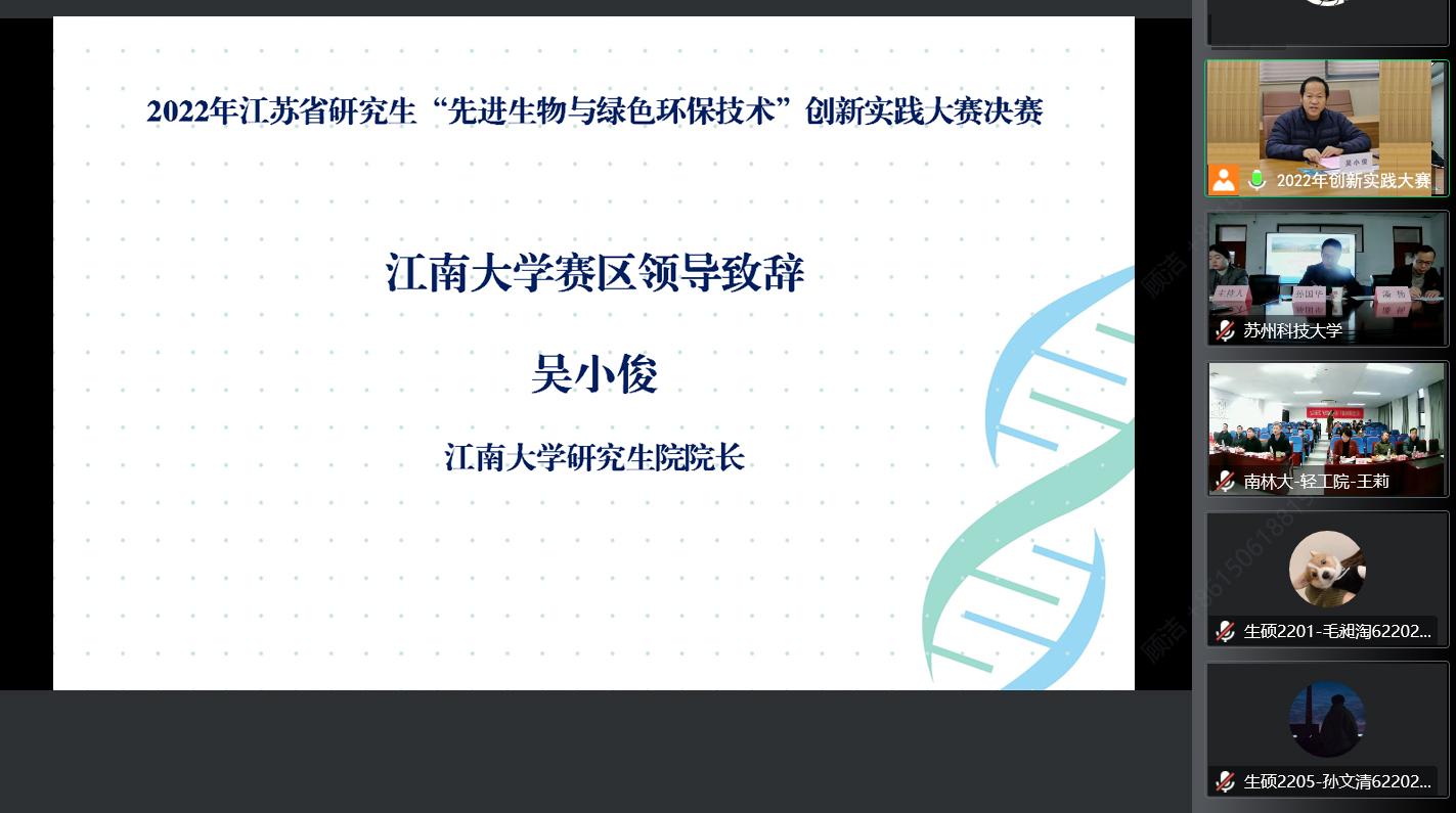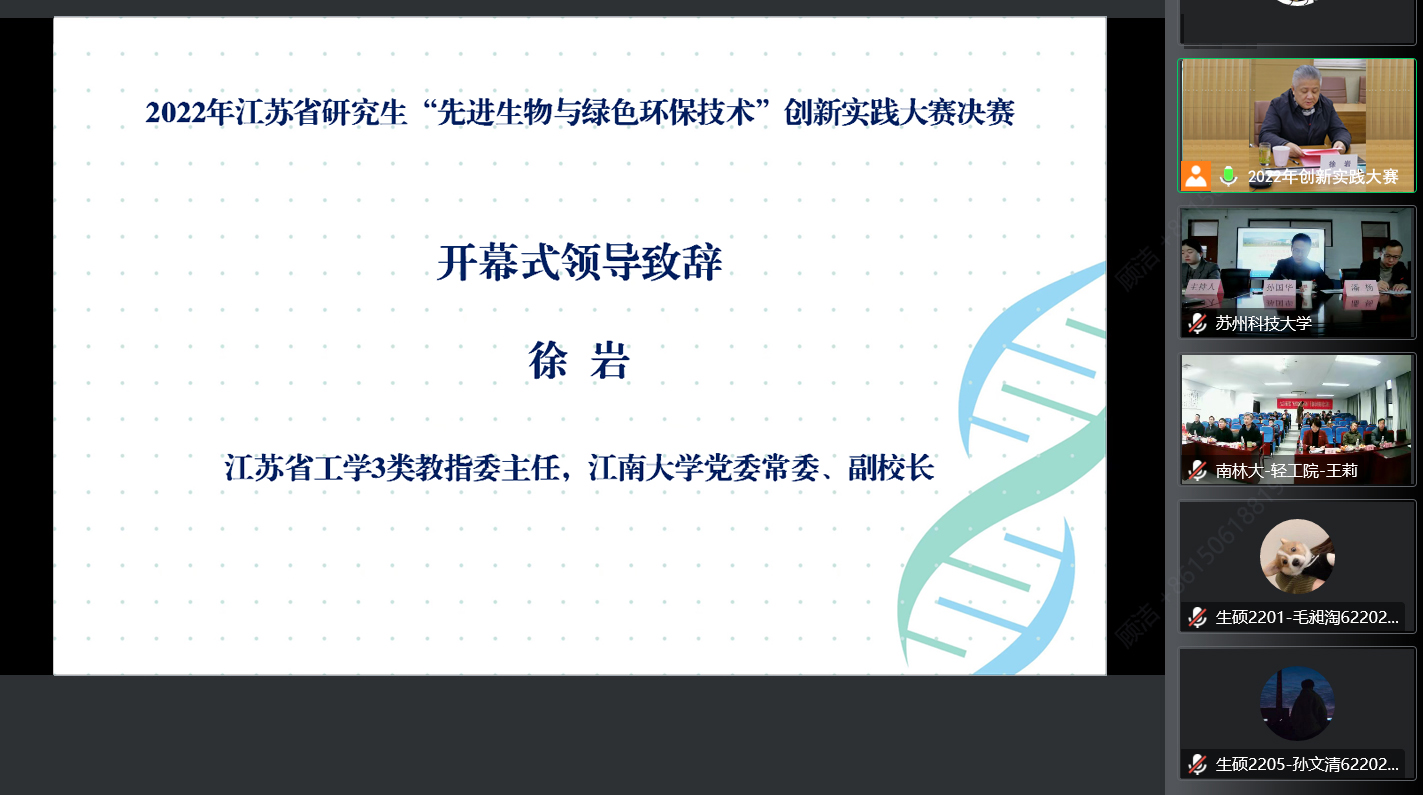 12月9日,由江苏省工学3类研究生教育指导委员会主办,beat365中文官网、南京林业大学、苏州科技大学、江苏大学联合承办的2022江苏省研究生“先进生物与绿色环保技术”创新实践大赛拉开帷幕。来自厦门大学、中国科学院青岛生物能源与过程研究所、华东理工大学、西安交通大学等20余所高校的400余名师生通过线上方式参加了本次大赛。江苏省工学3类教指委主任、beat365中文官网党委常委、副校长徐岩教授、beat365中文官网研究生院院长吴小俊教授、南京林业大学研究生院副院长翟胜丞教授、苏州科技大学学科办主任、研究生院常务副院长孙国华教授、江苏大学研究生院常务副院长蔡英凤教授等出席了开幕式。开幕式由beat365中文官网副院长聂尧主持。