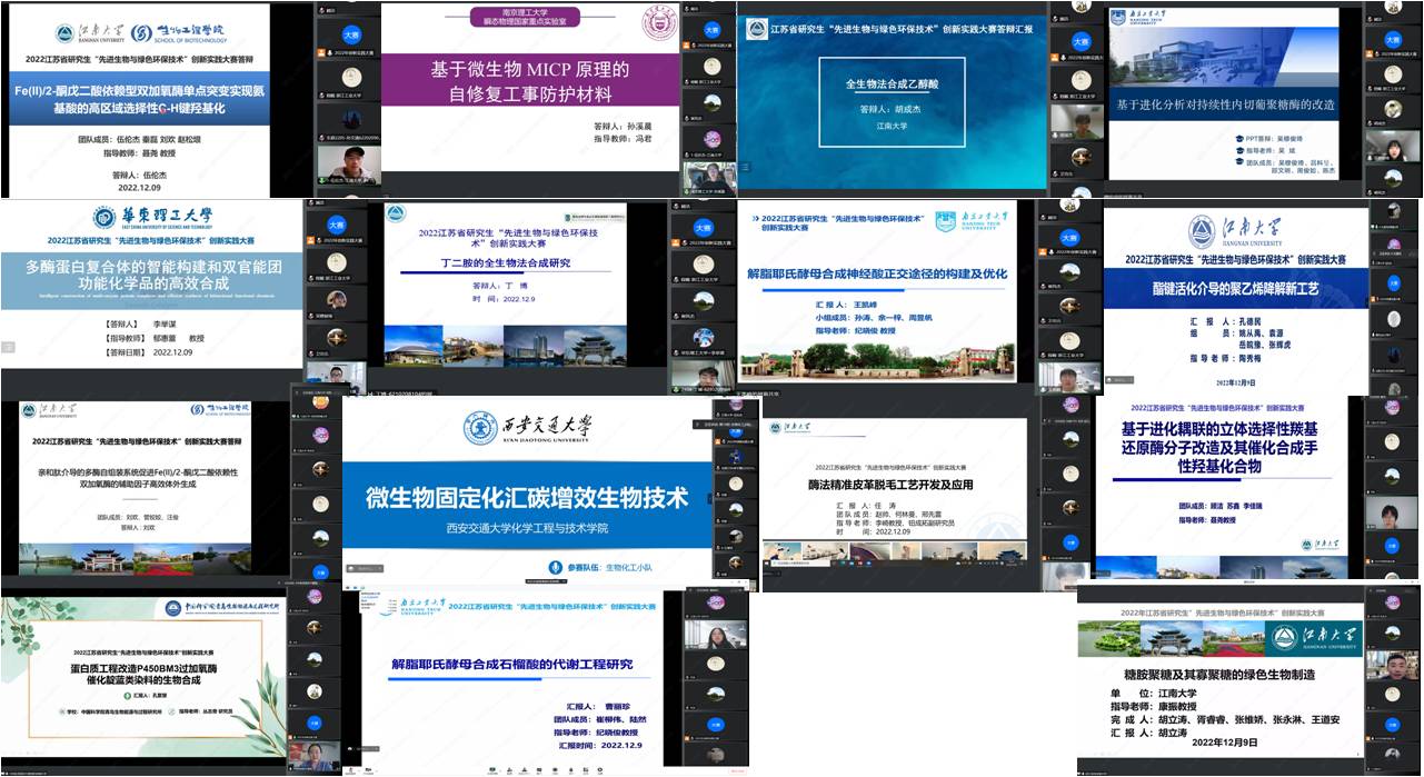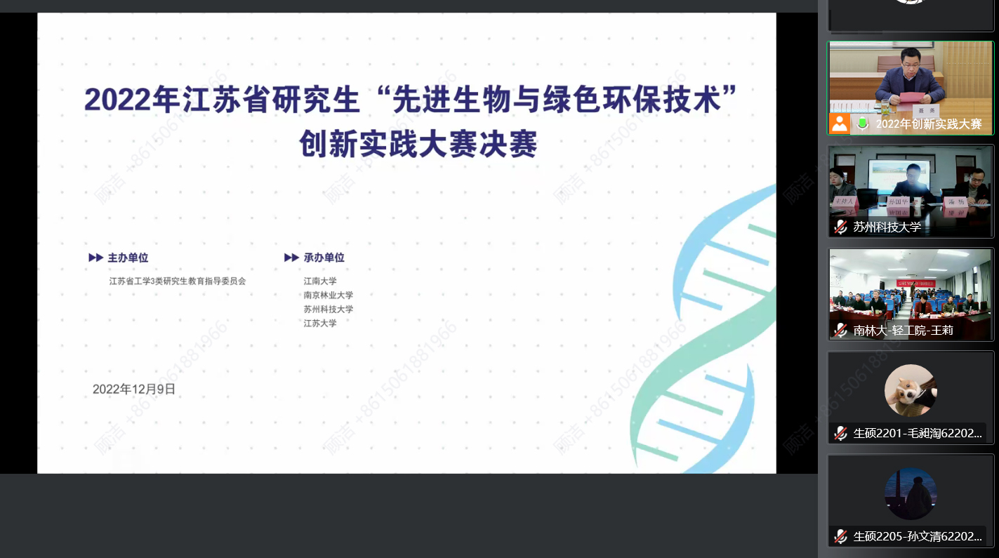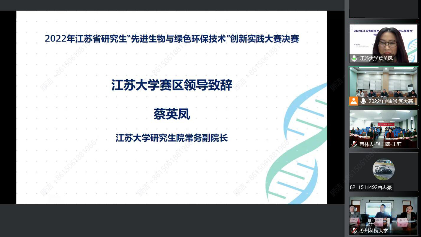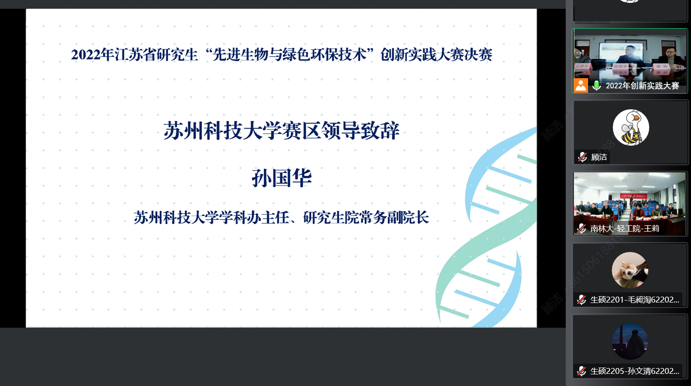 12月9日,由江苏省工学3类研究生教育指导委员会主办,beat365中文官网、南京林业大学、苏州科技大学、江苏大学联合承办的2022江苏省研究生“先进生物与绿色环保技术”创新实践大赛拉开帷幕。来自厦门大学、中国科学院青岛生物能源与过程研究所、华东理工大学、西安交通大学等20余所高校的400余名师生通过线上方式参加了本次大赛。江苏省工学3类教指委主任、beat365中文官网党委常委、副校长徐岩教授、beat365中文官网研究生院院长吴小俊教授、南京林业大学研究生院副院长翟胜丞教授、苏州科技大学学科办主任、研究生院常务副院长孙国华教授、江苏大学研究生院常务副院长蔡英凤教授等出席了开幕式。开幕式由beat365中文官网副院长聂尧主持。
