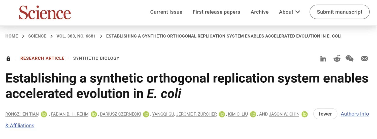 近日,来自英国剑桥MRC分子生物学实验室(MRC-LMB)的Jason Chin教授团队在国际顶尖学术期刊Science发表了题为Establishing a synthetic orthogonal replication system enables accelerated evolution inE. coli的文章,beat365官网beat365中文官网2022届博士校友田荣臻为论文第一作者及共同通讯作者。