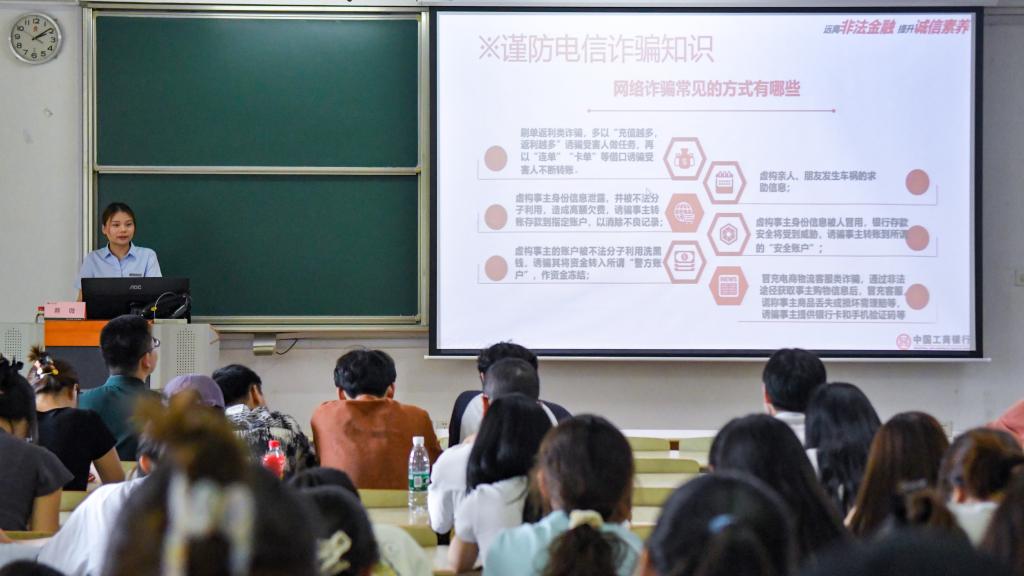5月21日下午,beat365中文官网在第二教学楼举办金融法制进校园宣讲活动,工商银行beat365中文官网支行蔡微行长受邀担任主讲嘉宾,学院研究生辅导员张同舟和150余名学生代表共同参加活动。本次讲座紧紧围绕“远离非法金融,提升诚信素养”这一主线。蔡微行长从“识破陷阱”“筑牢防线”“守护信用”三个板块切入,通过真实案例、数据对比和法律法规解读,层层递进揭示非法金融活动的危害与防范要点。“刷单返利、虚假购物、冒充客服退款……这些看似简单的骗术为何屡屡得逞?”蔡微通过高校学生受骗案例,剖析了诈骗分子利用大学生社会经验不足、追求兼职收益等心理设计的陷阱。蔡微还专门介绍了征信的相关知识,她结合《征信业管理条例》,阐释了逾期还款、过度借贷对个人信用记录的影响,并纠正了“花钱修复征信”等常见误区,引导同学们要珍惜个人信誉,践行契约精神,合理合法开展各类金融活动。