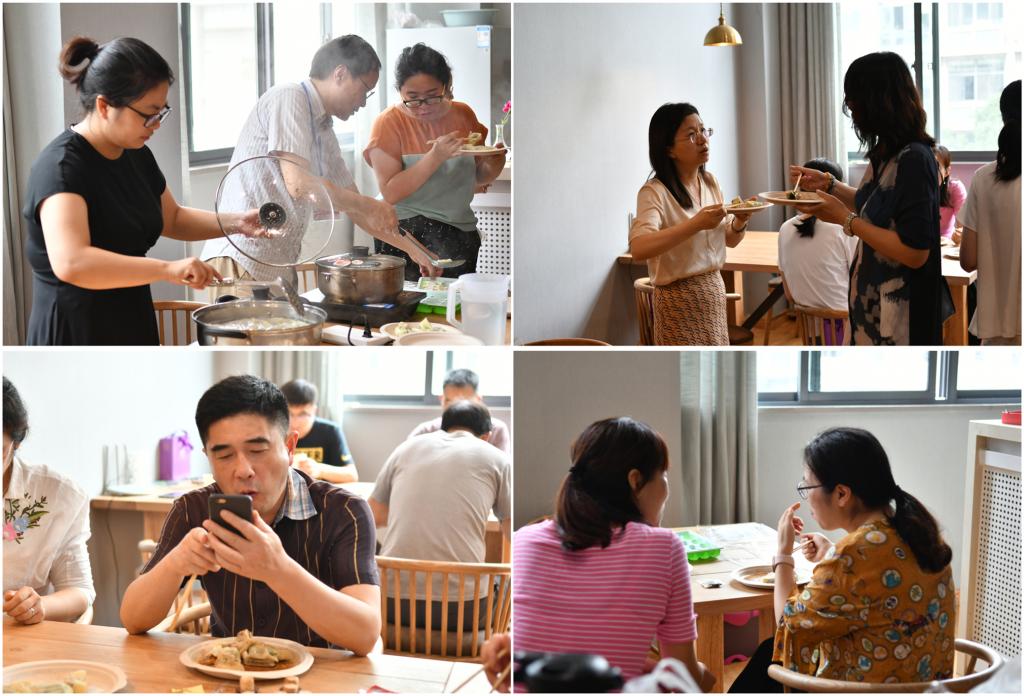 一手勺子、一手漏斗,充满传统美感的醋坛和竹篓在红色水标的映衬下仿佛让人置身深远的民俗记忆。打完陈醋,老师们分成小组煮水饺,享用美食美醋。在这种“慢调”氛围下,老师们分享童年趣事,互述家长里短,讨论热点时政,从紧张的工作中跳脱出来,得到了短暂的放松。
