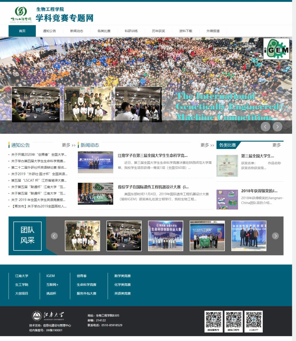 近三年,学院学科竞赛工作捷报频传,获奖全面开花,重点项目突破,成绩显著,学院学生创新创业团队在A类、B类学科竞赛上获得省级及以上奖项69项,其中国际级奖项5项、国家级奖项36项、省级奖项28项。在生命科学领域国内外顶级赛事iGEM中获得4个金奖1个银奖2个单项奖提名、“互联网+”获得1个国家级银奖、“挑战杯”获得1个省级特等奖1个国家级三等奖、“创青春”获得1个国家级三等奖,均实现了历史性突破。2019年,学院三支iGEM团队获得三项金奖和两个单项奖提名获得学校“教学科研优秀成果突出贡献奖”,近年来学院,学院学科竞赛工作和创新创业工作获得校内外的一致认可和肯定。