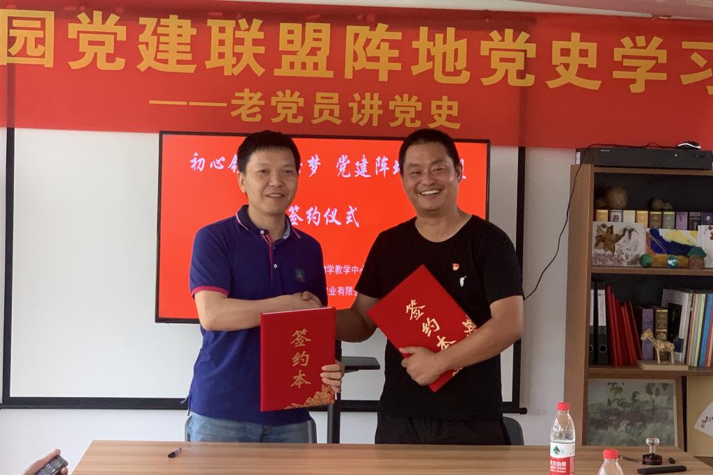 微生物学教学中心党支部书记陈献忠与万家田园党支部书记罗玉军签订党建联盟协议书,旨在发挥双方党支部的特色和优势,在技术创新,实习实践,联合探索等方面加强合作。