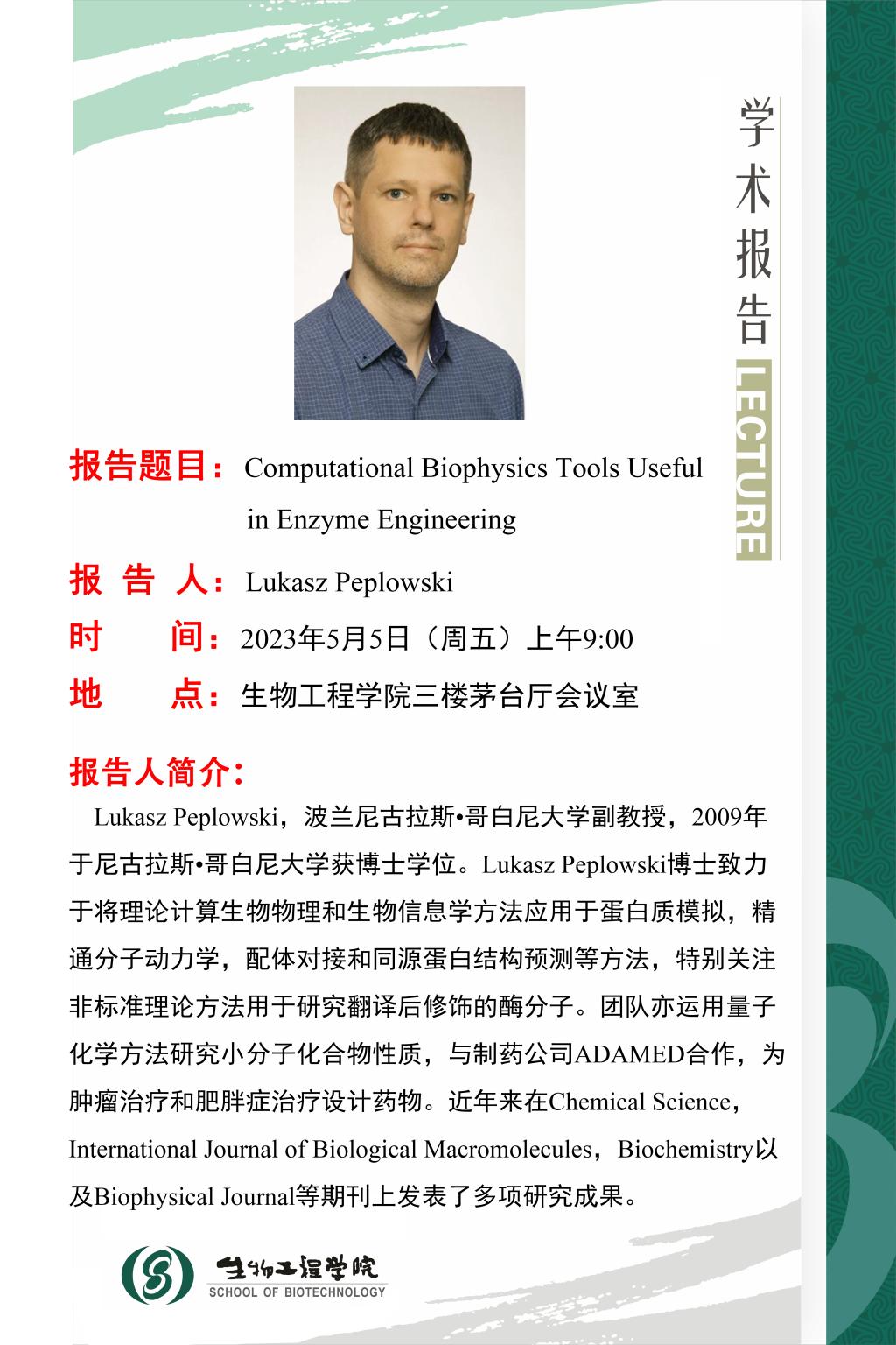 5月5日学术报告:Computational Biophysics Tools Useful in Enzyme Engineering