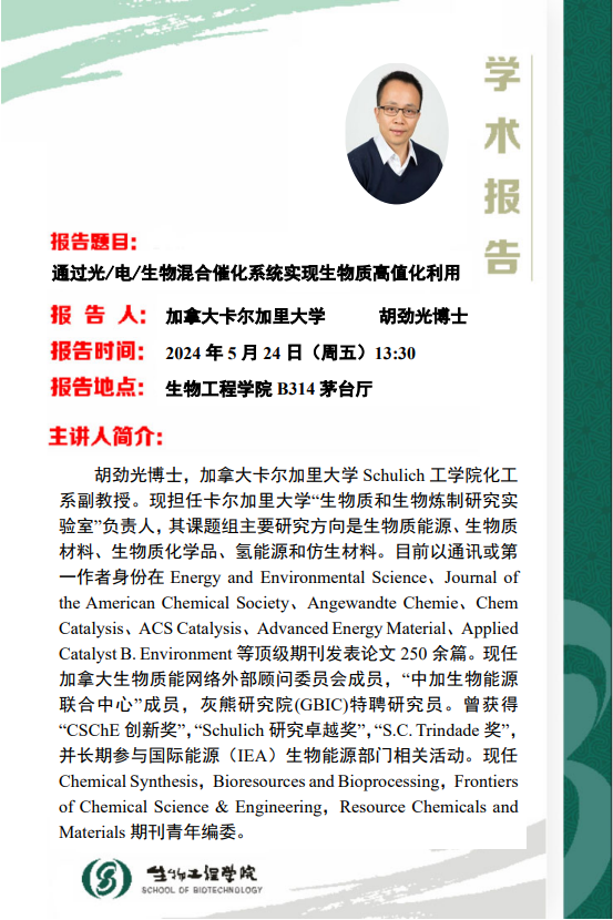 5月24日学术报告:通过光/电/生物混合催化系统实现生物质高值化利用