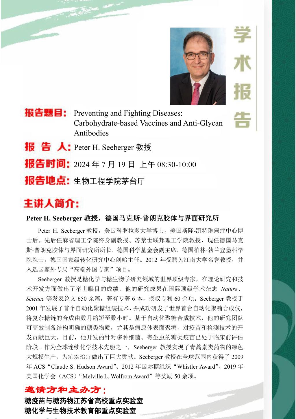 7月19日学术报告:Preventing and Fighting Diseases: Carbohydrate-based Vaccines and Anti-Glycan Antibodies