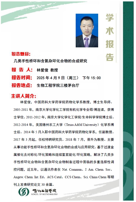 4月9日学术报告:几类手性桥环和含氮杂环化合物的合成研究