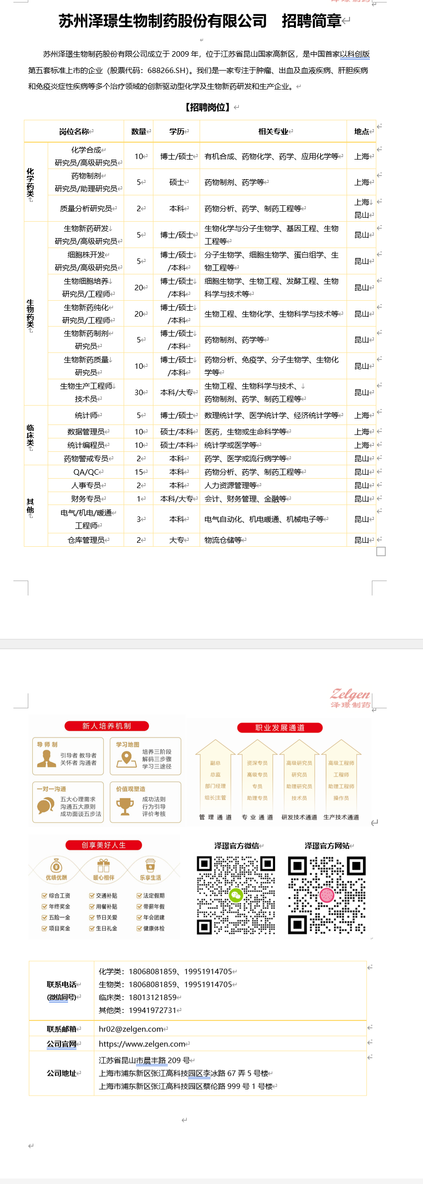 生工学院【2022】125号 苏州泽璟生物制药股份有限公司校园招聘