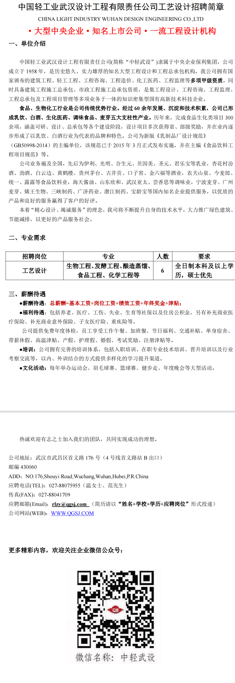 生工学院【2022】138号 中国轻工业武汉设计工程有限责任公司工艺设计招聘简章