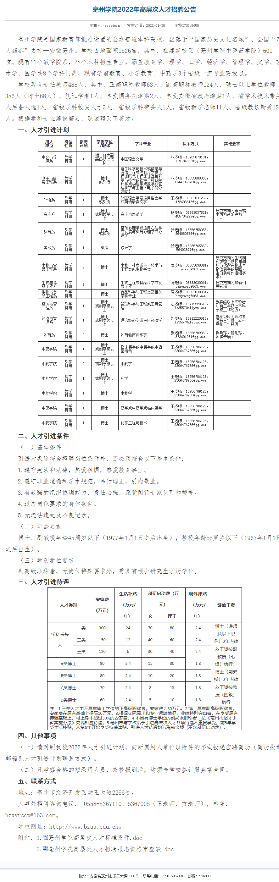 生工学院【2022】140号 亳州学院2022年高层次人才招聘公告