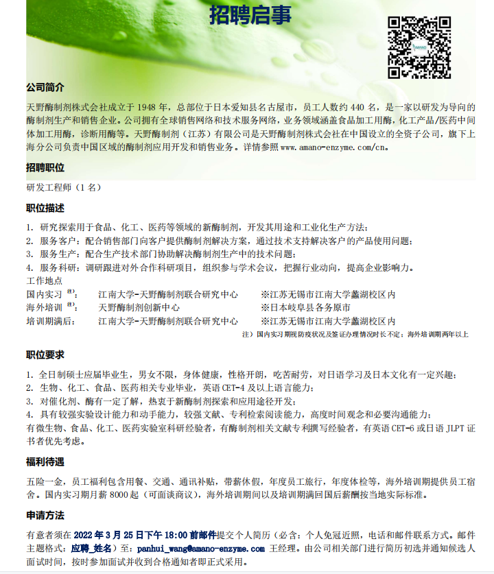 生工学院【2022】142号 天野酶制剂株式会社校园招聘